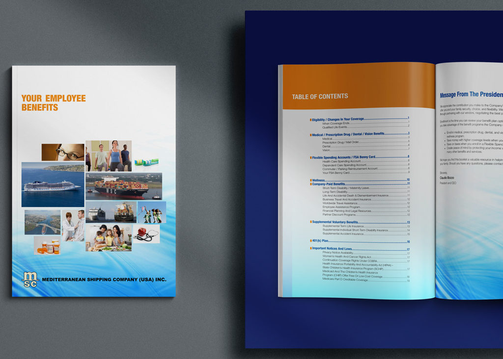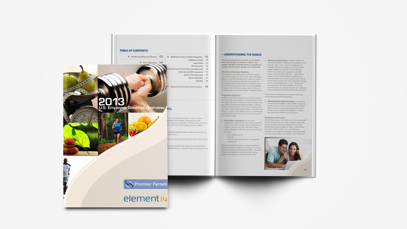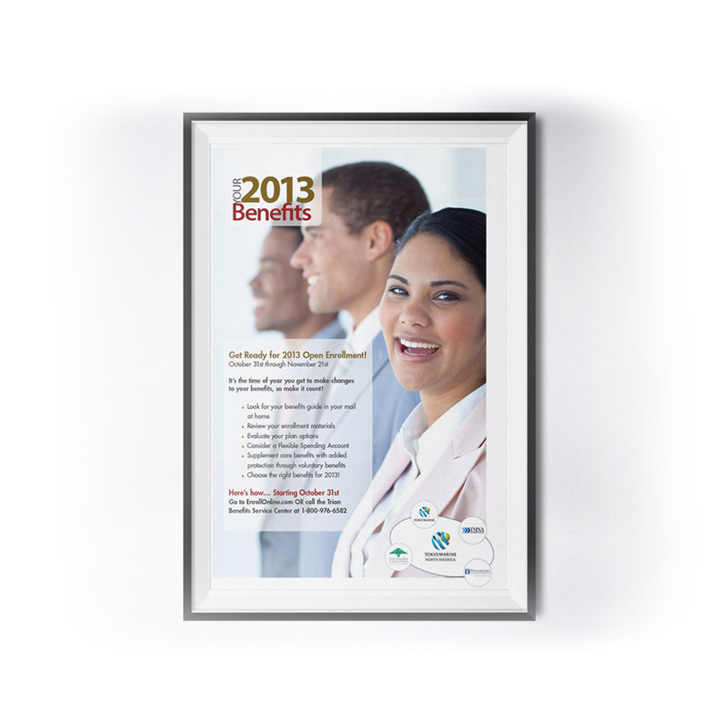Our design team created a comprehensive set of benefits materials for the client's employees, including employee packets, posters, postcard reminders, internal micro-sites, and interactive PDFs for open enrollment.